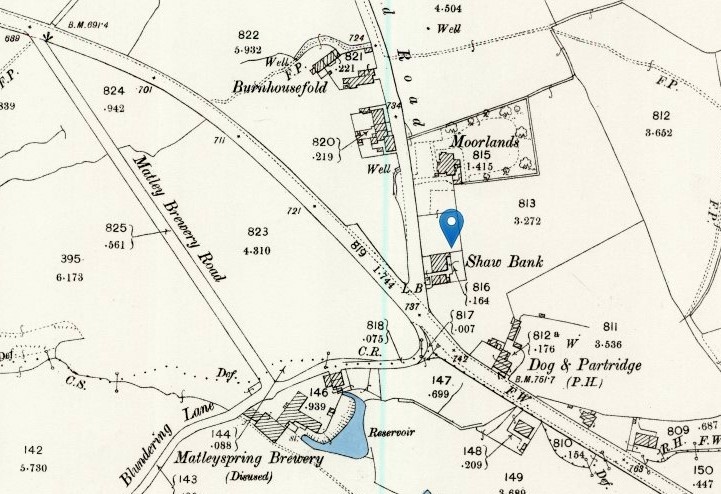 The revised OS map of 1896, published 1898, (shown below) indicates the location of Shaw Bank at the end of Mottram Old Road. Matley Brewery Road is now Woodend Lane, and Matley Spring Brewery, which used the spring water from Matley Spring, for brewing the beer, closed in the 1830s and was demolished in the 1950s. The Dog and Partridge pub on Mottram Road was demolished in 2019 and new houses have since been erected on the site.