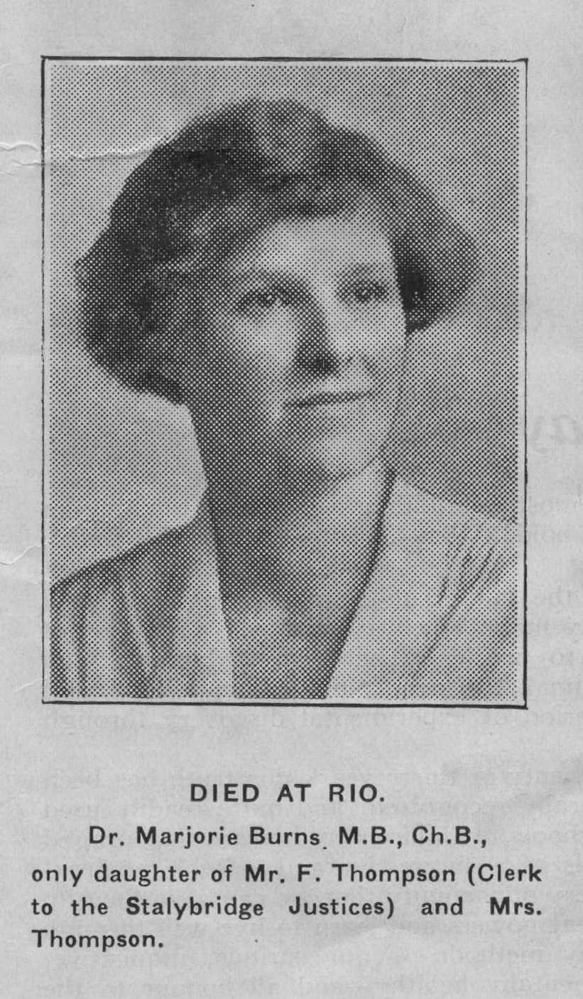 An entry in the 1930 Stalybridge Year Book Chronology on page 85 confirms this, where the caption reads: Death at Rio de Janiero of Dr Marjorie Burns (née Thompson) 21 March.