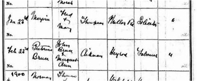 Note that in column 7, both parent’s names are given, which at that time, is most unusual. However, the officiating minister has incorrectly given the name of William’s mother as Edith, instead of Ethel. The witnesses to the marriage were William’s uncle Henry Lawrence Wheatley born in 1868 and Marjorie’s father and mother, Fred and Mary.