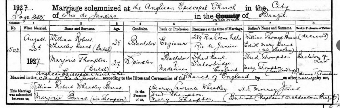 At some point after that, he must have returned to Rio de Janeiro, although no record could be found, since on 20 August 1927, when William Robert Wheatley Burns was 28 years of age, he married Marjorie Thompson aged 27 years at the Anglican Episcopal Church in the City of Rio de Janeiro in the United States of Brazil. The church is situated at 253 R. Haddock Lobo, Rio de Janeiro. The marriage ceremony was performed by Revd H.F. Morrey Jones, the British Chaplain and Archdeacon of Brazil.