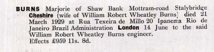 An entry in the 1930 Stalybridge Year Book Chronology on page 85 confirms this, where the caption reads: Death at Rio de Janiero of Dr Marjorie Burns (née Thompson) 21 March.